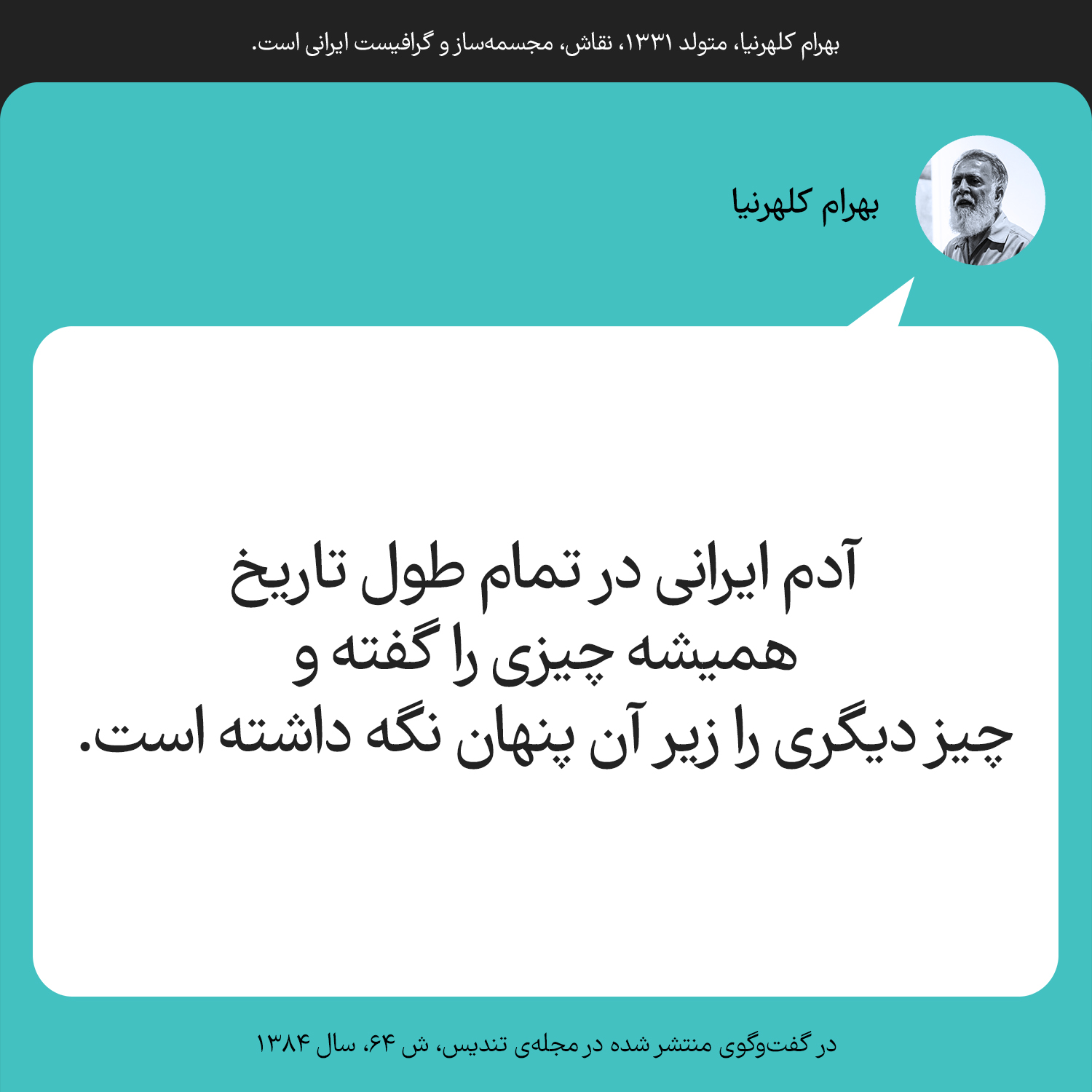 بهرام کلهرنیا، متولد ۱۳۳۱، نقاش، مجسمهساز و گرافیست ایرانی است.آدم ایرانی در تمام طول تاریخ همیشه چیزی را گفته و چیز دیگری را زیر آن پنهان نگه داشته است.