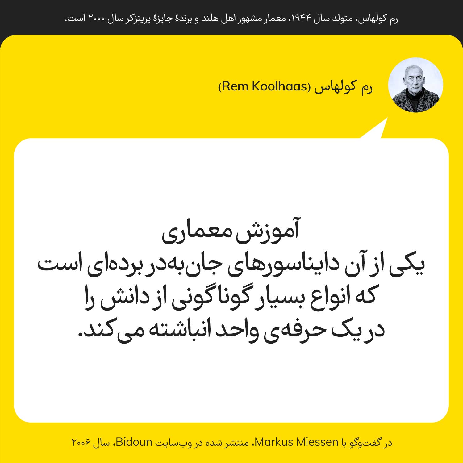 رم کولهاس، متولد سال ۱۹۴۴، معمار مشهور اهل هلند و برندهٔ جایزهٔ پریتزکر سال ۲۰۰۰ است.آموزش معماری یکی از آن دایناسورهای جان به در بردهای است که انواع بسیار گوناگونی از دانش را در یک حرفهی واحد انباشته میکند.